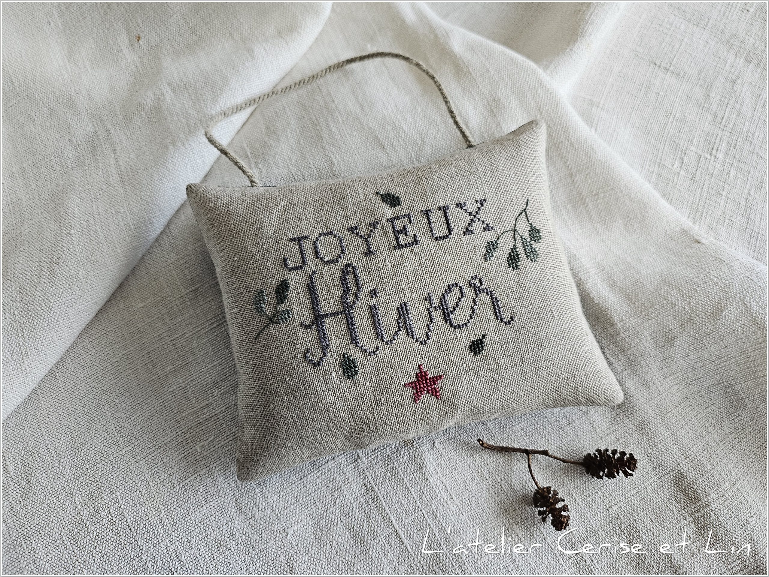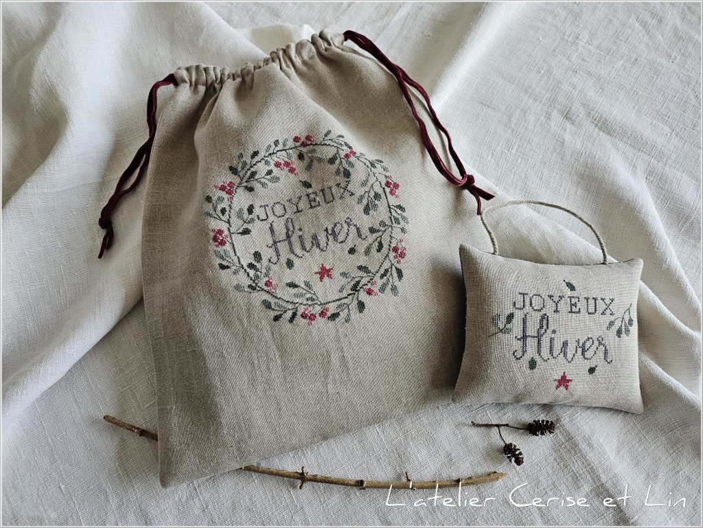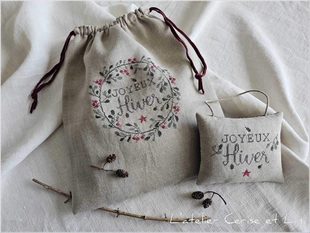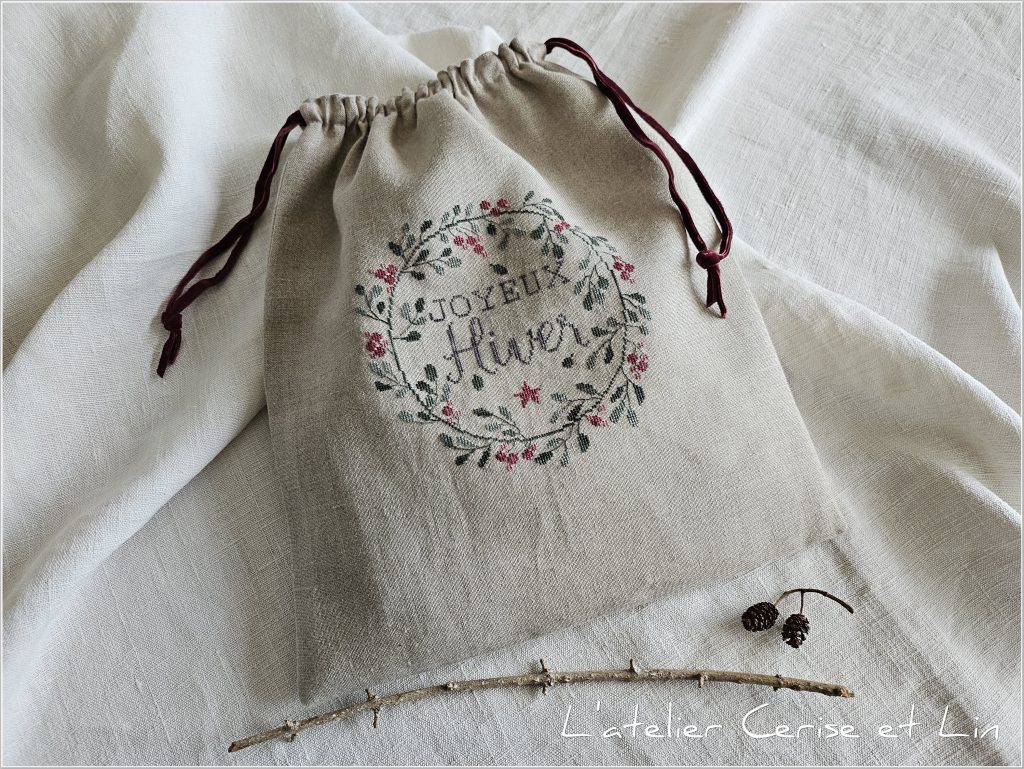 Grille «Joyeux Hiver» de Sophie B. (Histoires de Lin) brodée sur un lin Zweigart Newcastle Raw (53) avec les fils Histoires de lin préconisés. Ruban velours (Lobéron). Doublure du pochon en linge ancien.
