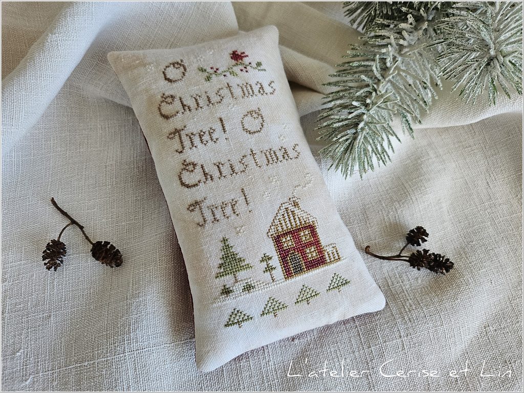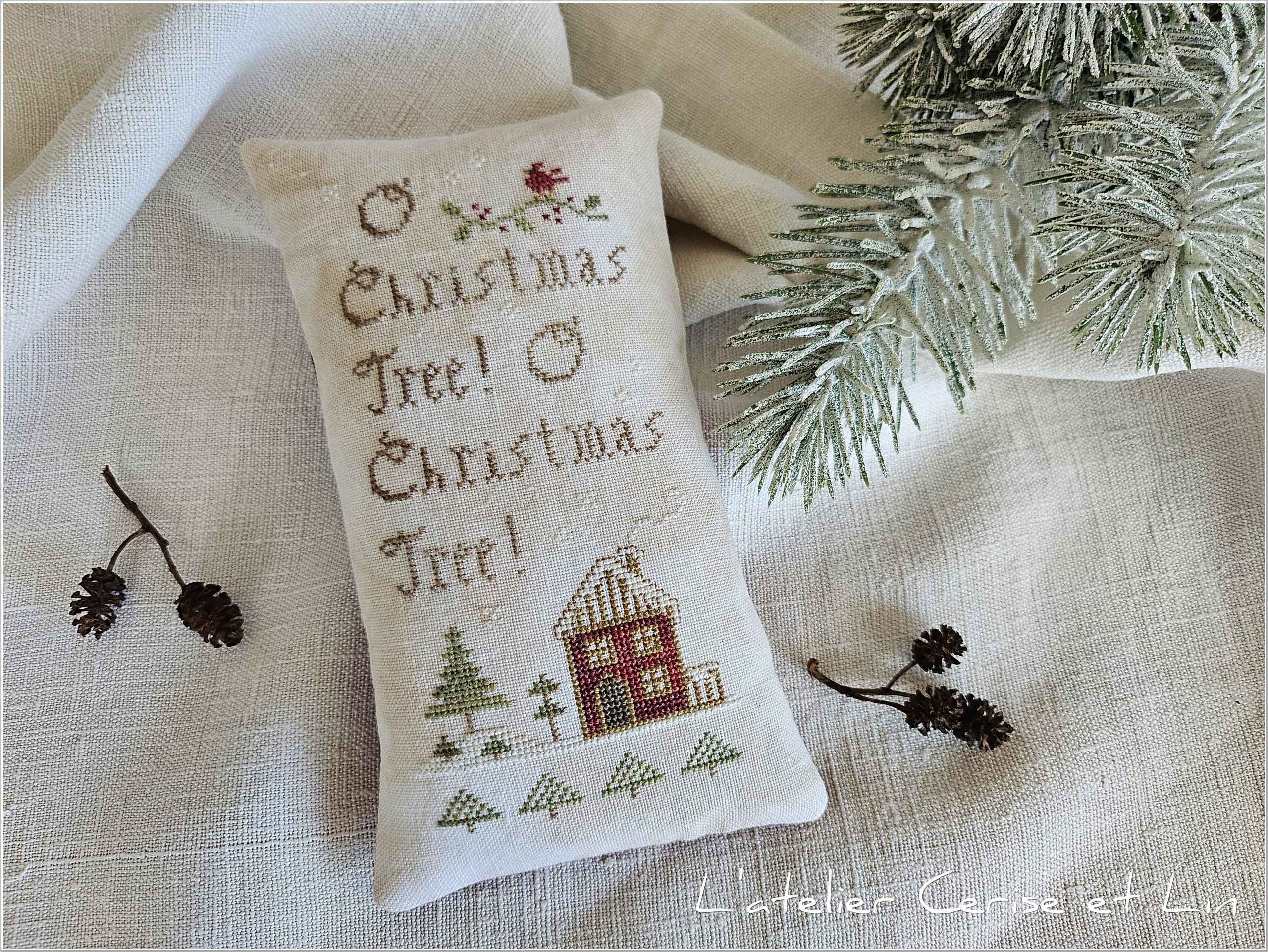 Grille « O Tannenbaum ! » de Brenda Gervais brodée sur lin Picture This Plus 40 ct Sand avec les fils préconisés. Au dos, tissu à pois Acufactum rouge brique (De Mère en Fille).